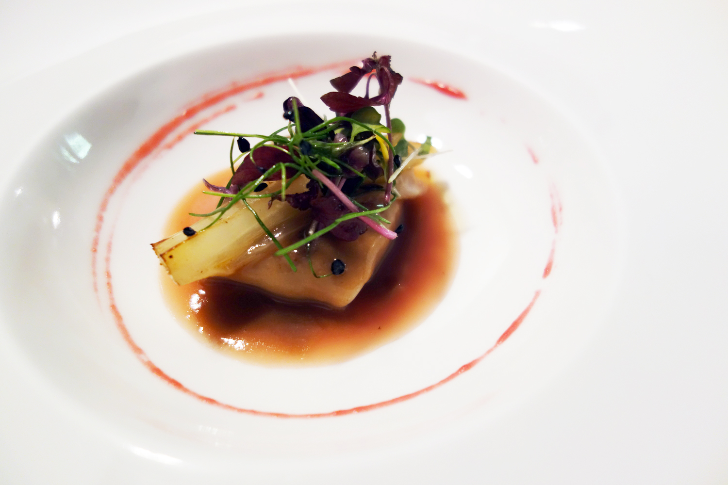 A single ravioli in the center of a bowl, glossy and smooth. It felt almost like the steamed noodle shahe fen made from rice flour and tapioca, and used in Cantonese dim sum rice rolls. The pillow was stuffed with grilled calf’s cheek and trotter meat and was sitting in a pool of silky, thick ham and beetroot puree that found a gorgeous harmony between smoky, salty pig and earthy, mineral root. The sauce added tons of flavor to the meaty filling, which contributed mostly a flaky texture of flesh but not too much flavor on its own. A single stalk of tender white asparagus was lain over the slippery surface of the ravioli and spicy kohlrabi sprouts were lain on top of that. This was a busy dish, but very well balanced.