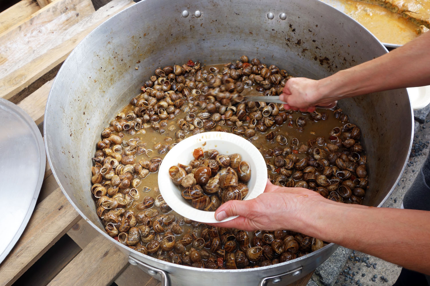 The first dish I came across was a gigantic pot of cargols dolços i coents, sweet and spicy snails cooked into a stew with small chunks of pork peeking out here and there. Each portion came with a slice of fluffy bread to soak up the savory broth left at the bottom of the bowl. I carried the snails over to my companions, who took turns trying to pull the curly little bits flesh out of the shell with a single prong of the plastic fork they gave me to eat this dish with. When it came time for me to dig in, I opted to sit and pull the little buggers out with my fingers. Each slimy, curlicued body leaves its shell home reluctantly. I popped each in my mouth and chewed until it was soft enough to swallow. The snails had a slightly earthy taste, while the pork added a wonderfully smoky, salty flavor to each mouthful. The sauce was sweet from almonds, hazelnuts and what I believe was chocolate mixed in. Chopped peppers brought a mild heat.