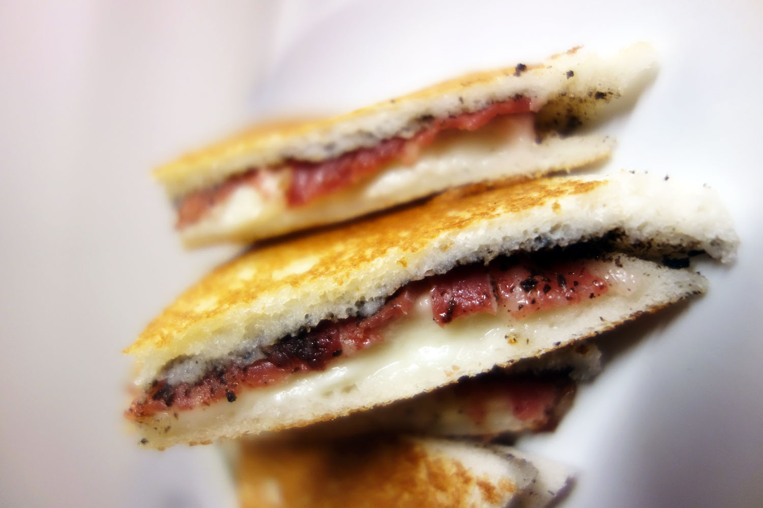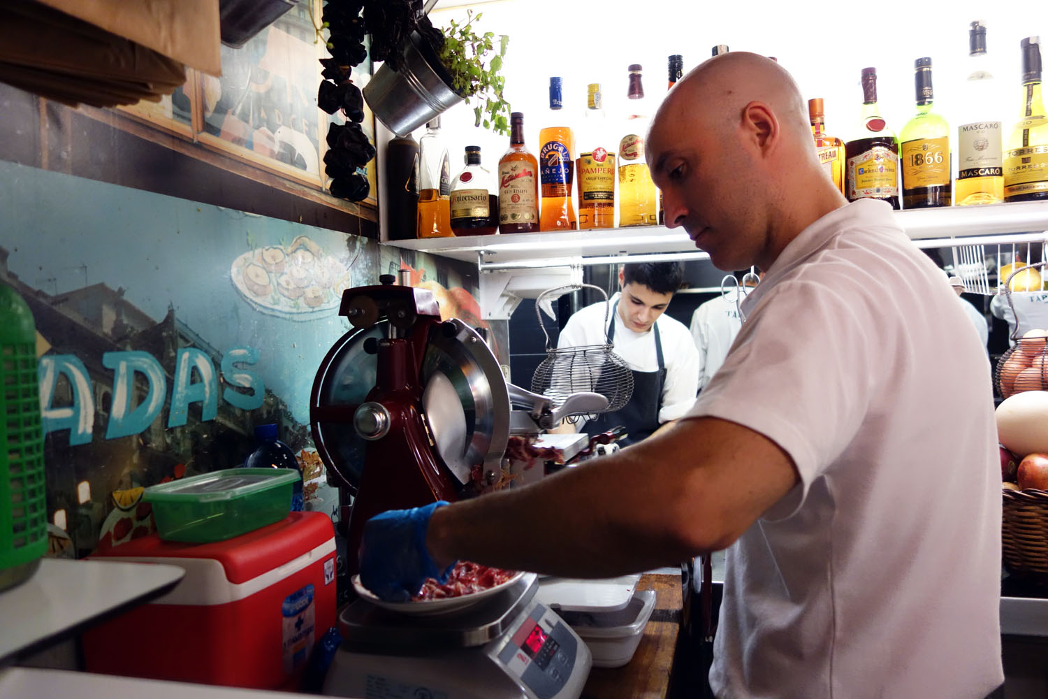 Next, the Bikini Comerç 24, inspired by the Chef’s other Barcelona venture. It’s a toasted finger sandie with gooey mozzarella, jamón ibérico and bits of black truffle slathered on, and it’s a cheap trick, but one that works. The crustless bread is thin enough to offer no more than its caramelized crunch to each bite, leaving the emphasis on the fillings. Velvet- smooth buff mozz flooded my mouth shamelessly as I bit through the toast. The slightly sweet cream flavor of the melting cheese providing the perfect canopy for the aged, cured funk of the ham, which was sliced at the bar in front of us and passed casually to the guy manning the sandwich press in the kitchen. The truffle elevated the already flawless ham and cheese by adding an earthy depth, that slightly dirty umami thang that stretched itself sultry on the clean bed of mozzarella. The perfect bar snack, good especially with vermouth.