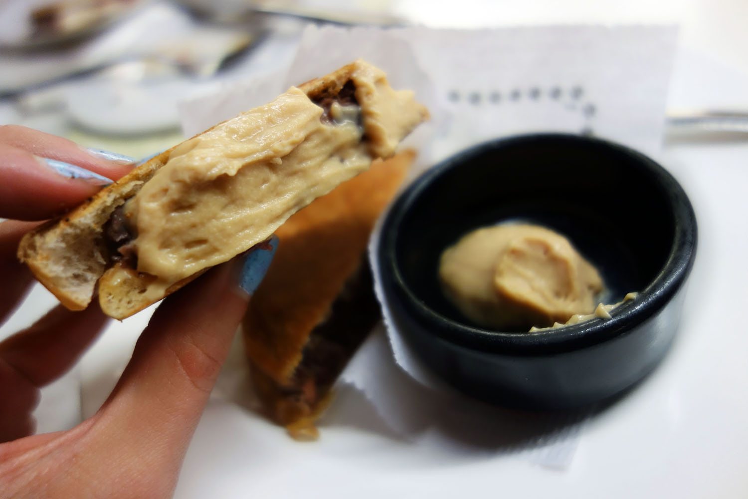 If the bikini is flirtatious, the McFoie Burger is nothing short of slutty. A toasted, buttery bun is pressed around a wad of quite rare beef that pours steam forth from minced flesh that feels like it’s still breathing. There’s just enough salt and a bit of caramelized onion to accent the wonderful flavor of perfectly (un)cooked meat dripping with juice. The bottom bun soaks some of this up, but remains so damn crunchy against the angel soft pillow topping it. The halved burger is wrapped in diner-style parchment paper the very touch of which suggests something cheap and greasy and wonderful. In the ramekin next to it is not a two-pump dollop of ketchup but a glossy quenelle of foie mousse to smear over the burger or to rub all over yourself or really to do whatever you want with since you paid for it anyway. It was a dense and dangerously rich spread served in way too generous a portion, with the nutty and mineral flavors of the foie soothed into a beautifully delicate liver butter. A madness took over me and I did not talk to my dinner companion as I took biting bits of burger, smearing other bites with foie, then spooning foie directly into my very willing face. I can see myself returning weekly to Tapas 24 just for this dish and a glass of vermouth. That very first bite made me a regular.