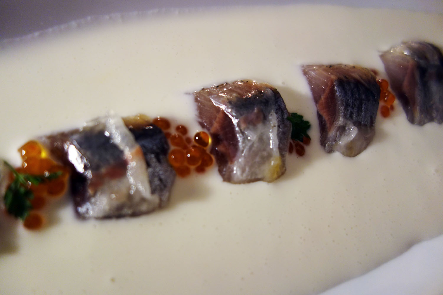 A row of salty, smokey hunks of sardine and intervening piles of bright orange trout roe were bathed in a pool of ajoblanco poured all around, tableside. Ajoblanco is a cold soup made of bread, crushed almonds, olive oil, salt and water. The bread is soaked overnight, garlic and almonds are crushed together in a mortar with a pestle, and the ingredients are combined with water and olive oil before being beaten into a frothy emulsion. Suculent’s version of the traditional cold soup is mild in flavor with a floral sweetness from the raw almonds mashed in. The sauce contrasts sharply with the salt and smoke of the fish and with the burst of brine from the trout caviar. It contrasts too sharply, in fact, for my taste. The two elements of the dish made me very happy separately. I wouldn’t order them again together.