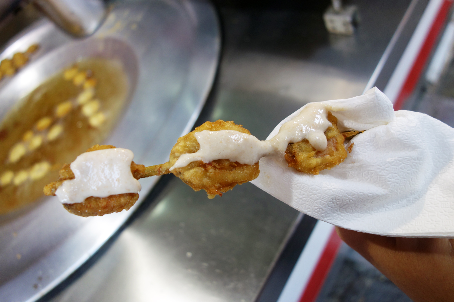 Not far from each midye dolma stand is one that sells its fried equivalent, the midye tava, served skewered onto a shish. The same unlicensed street mussels of unknown provenance, coated in flour (and sometimes egg yolk and beer), then deep fried in a vat of sizzling oil; these are another very popular snack available at any time of day. “It’s all about the sauce with these,” my Turkish friend told me as she added “tarator sos İle” to my order. The man nodded and spooned on a thick smear of tarator, made with dried bread crumbs, walnuts, lemon juice, salt, pepper, herbs and tahini. The most pronounced ingredient, however, is garlic. It’s a dense, nutty paste with wonderful flavor that makes the dish what it is. And for being fried street food, it’s not half bad. The mussels inside stay juicy and moist while the fried exterior crackles under the bite. Maybe the fried coat is a bit too thick for my taste, but I wasn’t expecting anything more refined. There’s excess oil aplenty but the lemon and garlic of the tarator help clean up the flavor. Overall its a satisfying and cheap as hell snack that I see myself indulging in on a regular basis as an Istanbul resident.