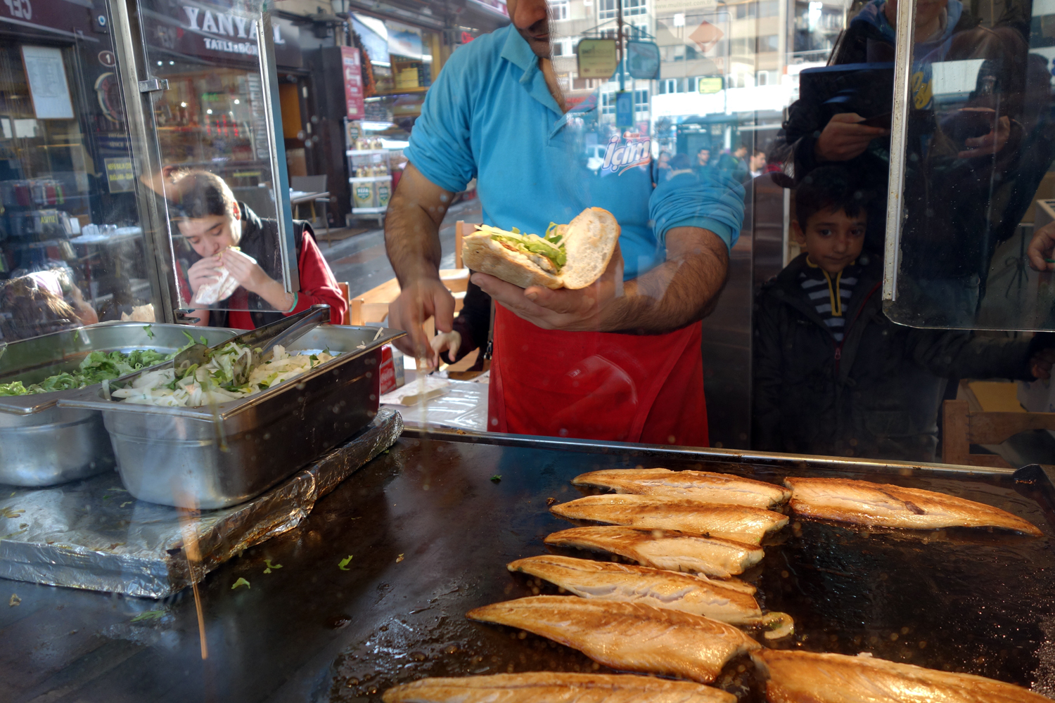 The sandwich can be traced back a few decades to when fishermen would sell their catch from the Bosphorus and Marmara Sea on boats near the Galata Bridge over the Golden Horn. Some of the more enterprising of vendors decided to bring grills on deck and sell ready-to-eat sandwiches made from the only thing they had lying around, fresh fish. Pretty soon the trend caught on and the people of Istanbul picked their favorites. But then Turkey applied to the EU and balık ekmek was shunned for some time, along with all those other cheap, popular and wonderful street food snacks prepared under deplorable sanitary conditions. Turkey’s fishing industry also received a blow due to overfishing of the Bosphorus so that what did remain of this once popular snack had to be made with mackerel imported from Norway or Morocco. To this day you’ll be hard-pressed to find a place that sells fish from the Bosphorus. Even if you did, you probably wouldn’t want to eat it.