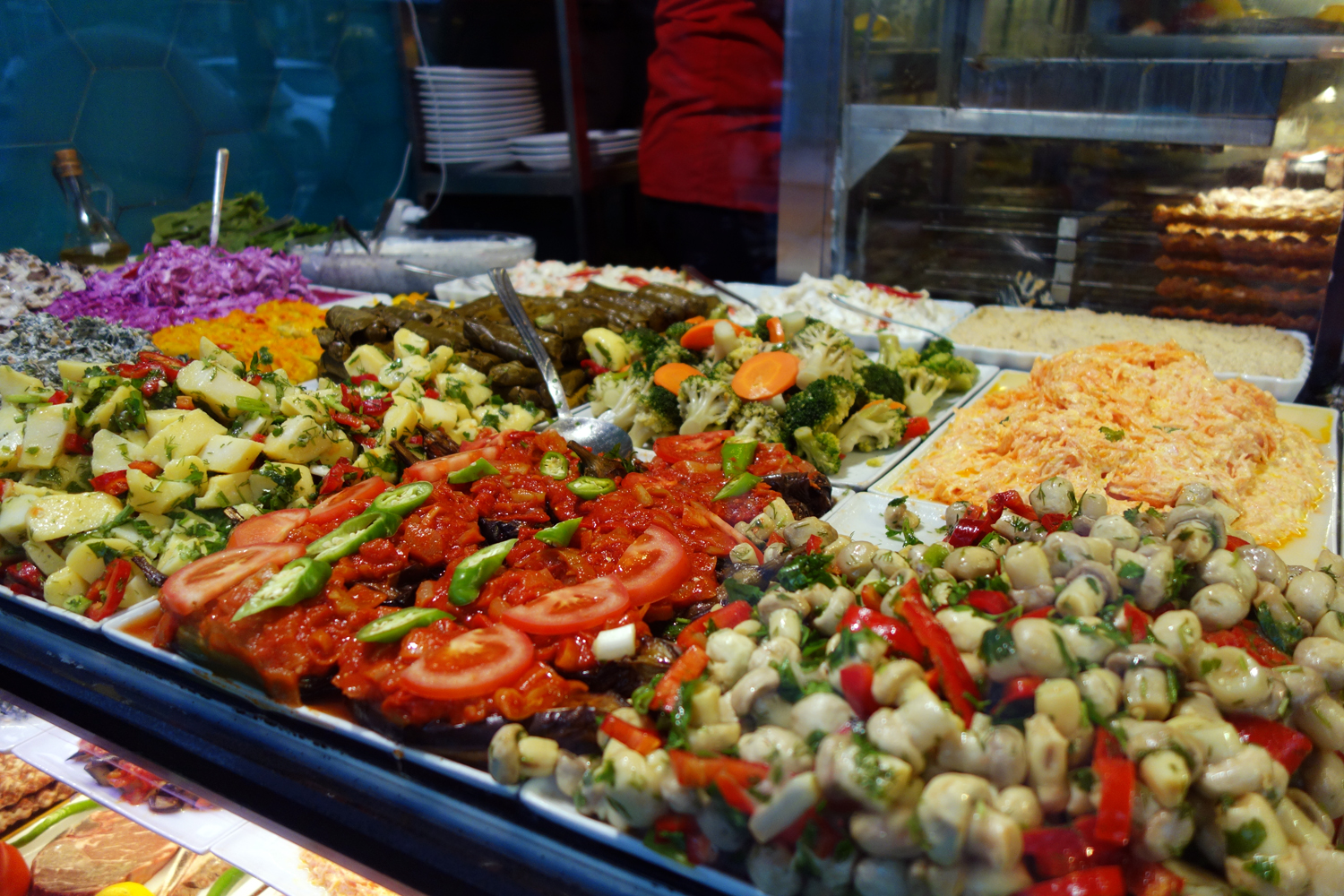 As we ate, waiters passed by with massive trays, colorful mixed mezze platters ordered for whole families to share. My mouth watered as I heard kebabs still sizzling on the şiş, as I smelled the deeply herby aromas of the grilled veggies and grains.