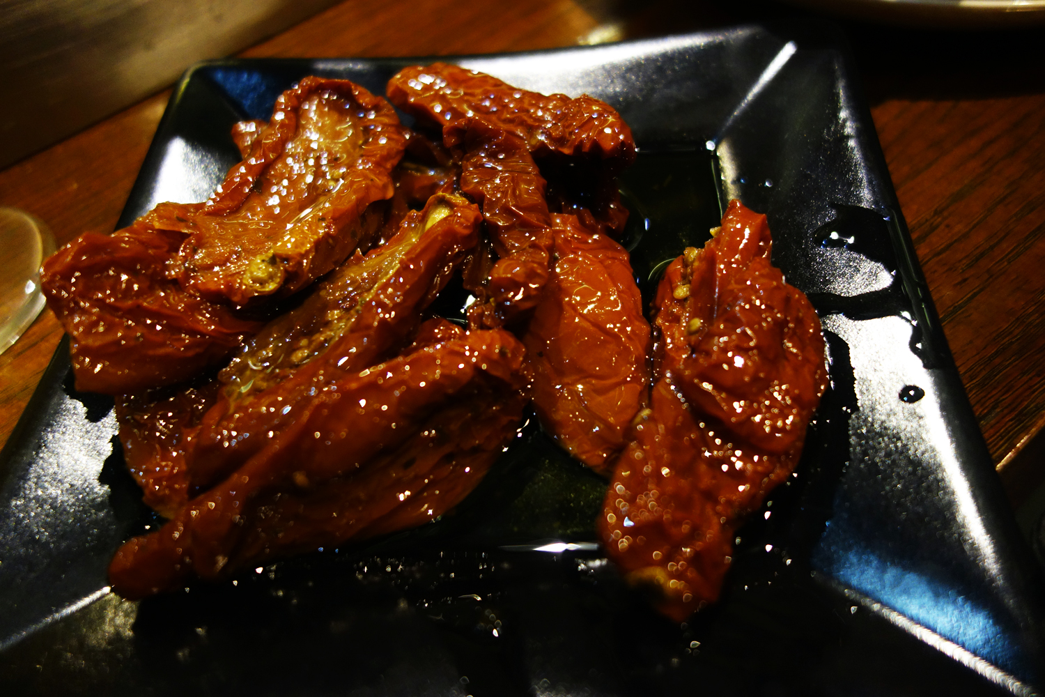 Sun-dried tomatoes are always a great item to snack on at a tapas place as you wait for the more serious dishes to be arranged and plated. These are nice, doubtless pulled from the jar in which they’ve been preserved in olive oil for what could be decades. The flavors are concentrated and sultry, similar to roasted tomatoes or an already seasoned marinara sauce. They’re tender and just moist enough from the oil, a great topper for slices of baguette. I’d recommend pairing them with good manchego or goat cheese.
