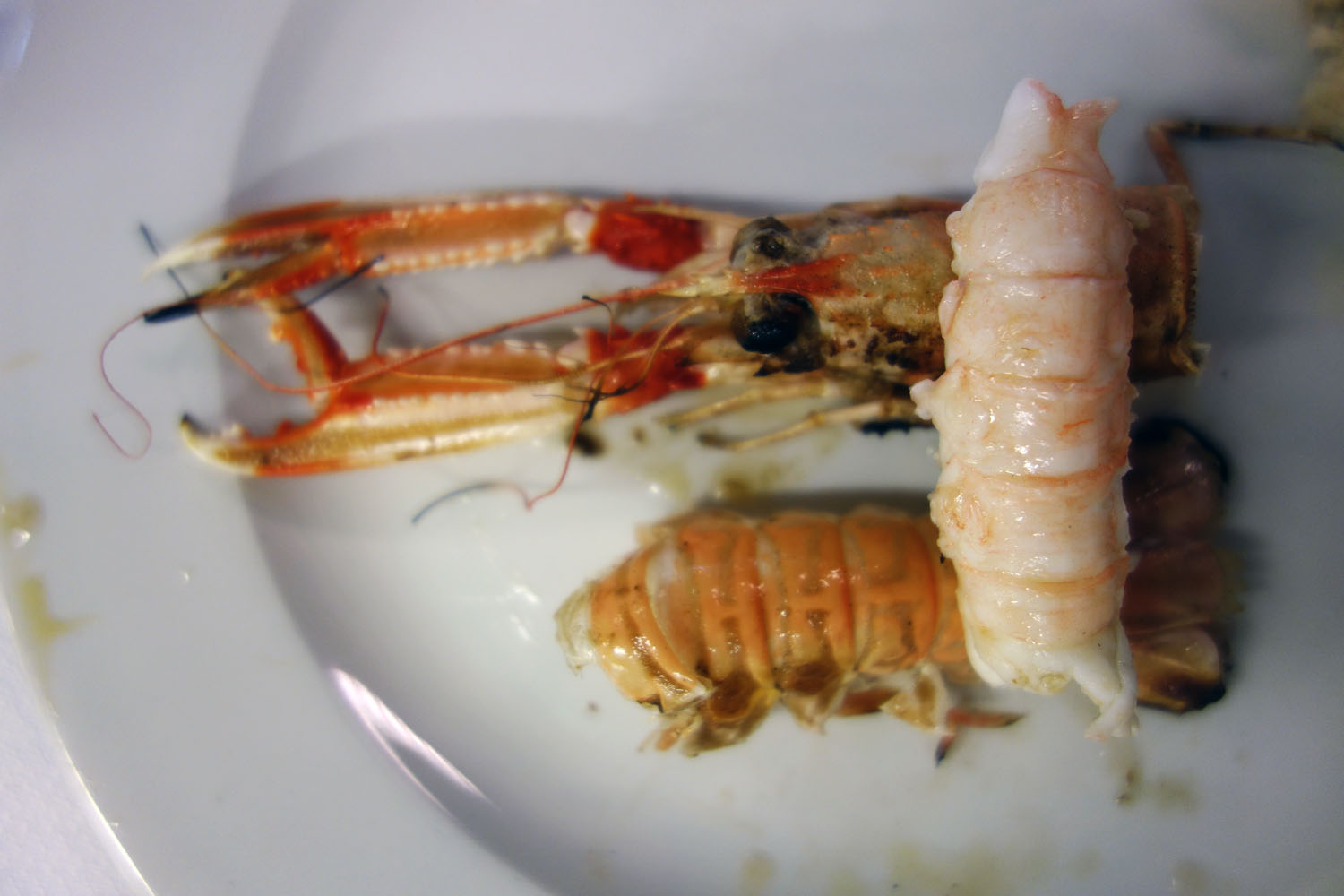 We ordered some langoustines done on the grill with oil, a pleasantly simple preparation of the very fresh and buxom creature. We twisted each tail off the upper body and cracked a straight fault in the underside of the shell. The brittle exoskeleton yielded forth a wonderfully juicy, firm yet smooth log of delicious marine meat. I devoured these plump lumps in two bites each, savoring the moist fibers of clean, creamy flesh. Sweet, white tail meat licked lightly with char from the grill was followed by a luxurious shot of briny, smoky head juice squeezed and sucked directly from the thorax. We devoured the tasty crustaceans in silence and kept the shrimp stink on our fingertips as welcome souvenirs of the meal.