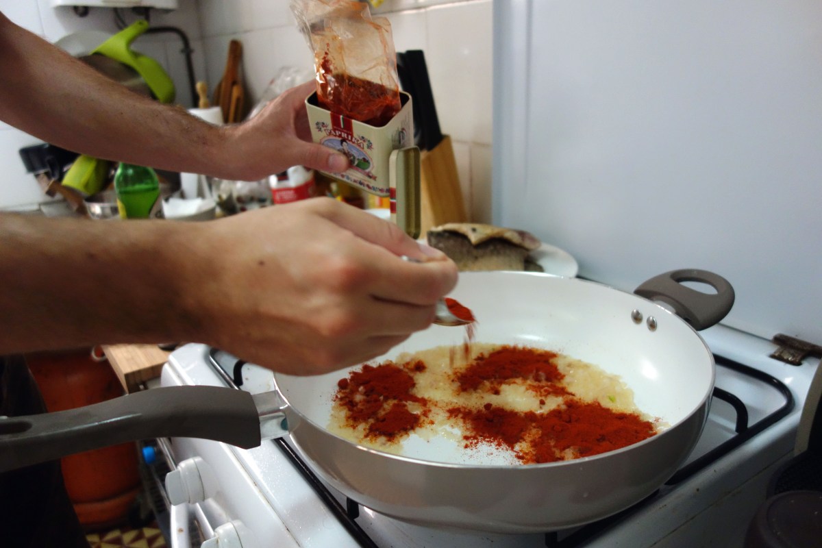 7 Published July 27, 2015 at 5472 × 3648 in A Recipe that Matters: Pontypaprikás Túróscsuszával ← Previous Next → Adding paprika to the minced and sauteed onions to make the paprikás base. Important to turn the heat off when doing so, as paprika burns quite easily.