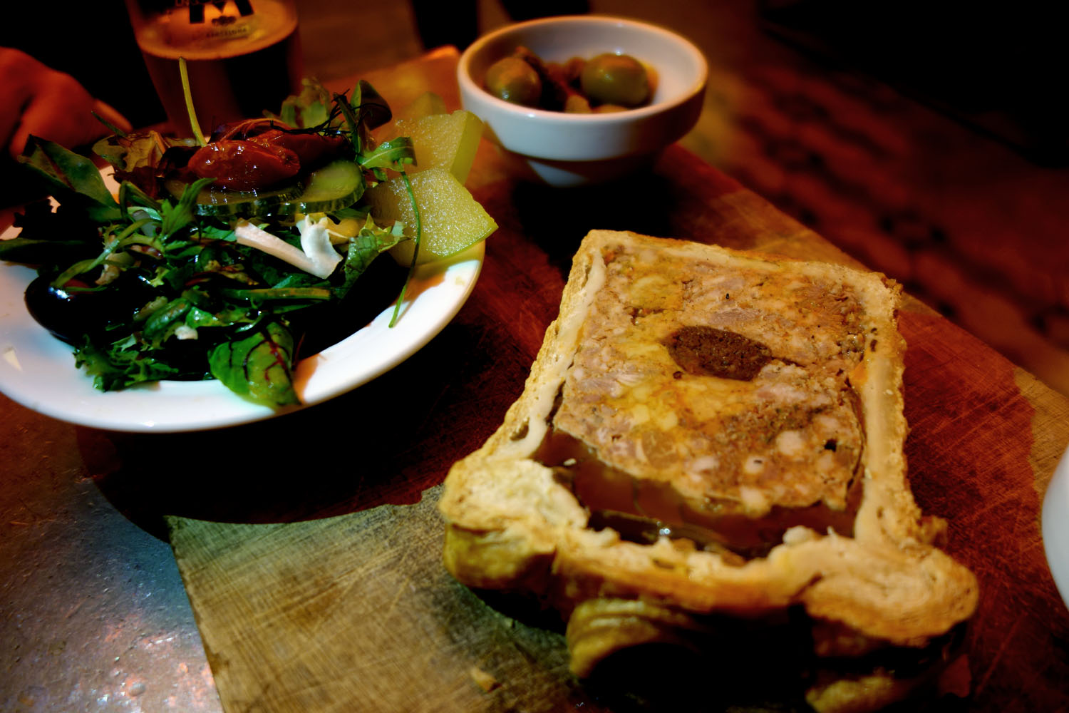 Pâté en Croûte of Ibérico pork served with a side salad, a ramekin of pickles and sweet applesauce on the side. The pâté itself was quite dense and hearty, crumbly and coarse chunks of pork laced with solidified pools of bright white fat. It was wrapped with a thick and buttery pastry crust that was baked to a gorgeous golden brown and decorated with little curly-cue details in the dough. As the loaf cooks, a pocket of air forms above the forcemeat from the steam coming off the latter; after baking, this space is filled with aspic, which is poured in hot liquid form though holes pierced into the dough. The aspic solidifies and expands as the thing is cooled. When the loaf is finally sliced, the cross-section shows this gorgeous layer of jiggly, yellow meat stock gelatin.