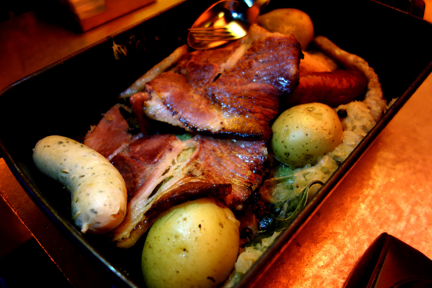 A sizeable pan came sizzling right from the oven, loaded with strips of ham hock and fatback, sausages and potatoes all snoozing on a cozy bed of sauerkraut. This is a greasy, heavy dish and one that makes me feel at home, as it is quite similar to the grub found at the Christmas markets in Hungary and all over Eastern Europe, where the dish probably originated. It made its way into France with the annexation of Alsace and Lorraine (formerly German) in 1648 and became known there as choucroute garnie. The dish was widely adopted all over France and its recipe was tweaked a bit to suit the local palate (a.k.a. they added wine).