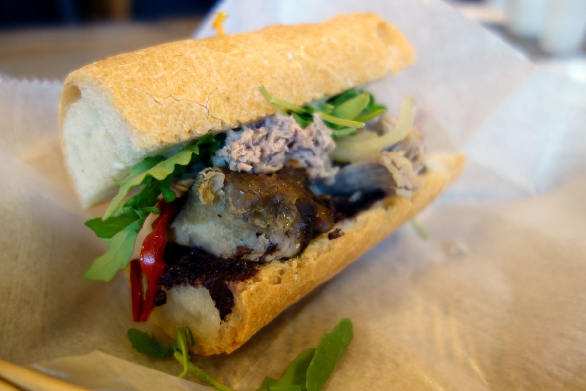 3 Published December 7, 2015 at 1500 × 1000 in That Mahatma Gloves at Hi-Rise Bread Company ← Previous Next → The Jeneric with hunks of smoked pork, a salad of chopped olives, caramelized onoions, roasted red peppers, chive aioli on a baguette