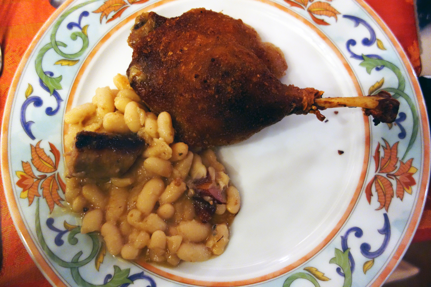 Cassoulet is a rich bean and meat stew cooked in an earthenware pot called a cassole. It is believed to have originated as a peasant dish in the the Languedoc region of Southern France. Legend has it that the stew was a result of the townspeople of Castelnaudary throwing their remaining meats and veg into a single cauldron to feed themselves during a lengthy siege of the town in the 14th century. Likely it can be traced back even further as the stew hints strongly at Arab influence, just like the bean and sausage dishes (e.g.: ollada and escuedella) of northern Catalonia. As with similar traditional comfort food classics, there are as many recipes for cassoulet as there are families and grandmothers in the region. However, three major versions exist, each one specific to a town within the Languedoc. The cassoulet of Castelnaudary is said to be the most basic, yet strictest on the ingredients used. Only water from the town and produce from Lauragais can be used to prepare it. In Carcassonne they add partridge or shoulder of lamb. In Toulouse it’s made with bits of smokey pork skin and local pork sausage; it’s topped with a confit of either goose or duck.