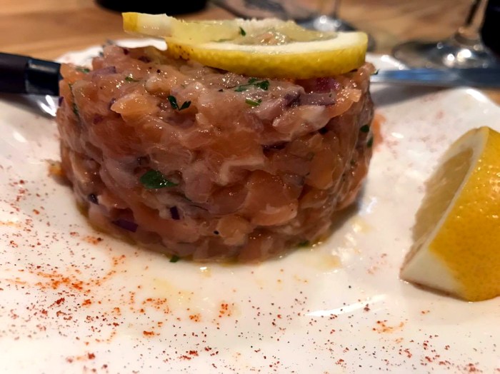 All but one of us ordered the salmon tartare flavored with shallot, parsley, piment d’Espelette and lemon for a beautiful, balanced finish. The fish was chopped into rough little cubes that stuck together nicely for a satisfying mouthful. A bit fatty for additional flavor and decadence, but with any remaining “greasy” feeling perfectly cleaned up by the citrus in the seasoning. Awesome also in portion size, this cylindrical protein bomb had a petite 4” diameter, the perfect amount for a boost of energy without weighing me down for the rest of the afternoon. I’d recommend asking the guy what dry white goes best with this tartare. But whatever we were having was the perfect match.