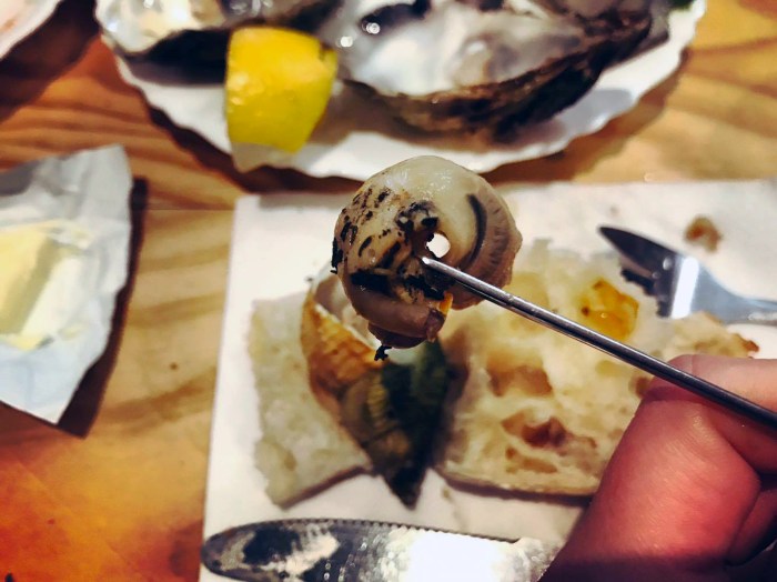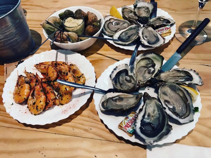 Big wooden tables and cozy chairs, a bar nearby and an open kitchenette. Two young guys running the show. The wine list is perfectly matched to its seafood-centric menu – all French, but from several different regions, mostly white (except, oddly, a Hungarian Tokaji dry Furmint). A chalkboard lists the day’s offering, almost all fish or shellfish, but some cooked dishes like baked camembert, lasagna and linguini with shrimp on there too. There’s lots of little things to snack on and share, like salmon rillettes, crab claws, octopus salad and langoustines. Everything is served pretty simply and, as always, with a side of bread.
