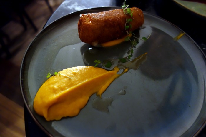 Next up, Ben’s favorite – a cordon bleu of guinea fowl from Ferme du Vignal in Castelnaud de Gratecambe, in Lot-et-Garonne. The golden brown and delicious fried, breadcrumb-coated roulade was made of the most tender poultry I have tasted in a while. A tight but heavenly soft breast butterflied, covered with a thin slice of ham and slice of quickly melting white cheese which squirted out when the roll was sliced into. A fried thing but beautifully executed, not too heavy and immensely satisfying. Next to it, a mustard-yellow, warm puree of seasonal veggies to dip into. This tasted like a frothy and thick blend of carrots and olive oil, another perfect introduction to the flavors of spring.