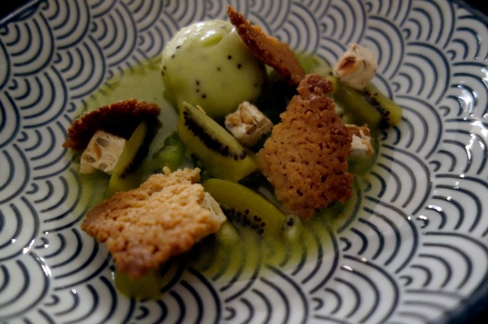 Our meal at Belle Campagne was great. Their kiwi-based Lo Kiwai dessert was a masterpiece, and one that I will remember for a very long time. This stunning dish combined the particular class of acidity and sweetness characteristic of kiwis in various stages of maturity with the ripe, floral taste of olive oil. Add to this an array of different textures to make each bite unique and interesting. Swimming in a silky-smooth and lightly emulsified soup of Cordes-sur-Ciel olive oil were perfectly ripe Kiwis Gold, scooped into small balls that were then sliced into slick wedges that made the perfect petite bites. There was also a delicate ball of kiwi sorbet, melting its kiwi essence into the soup and mixing beautifully with the vegetal flavor of the oil. And then, the texture: a crumbly, crunchy cookie with a very delicate sweetness and some cubes of chewy nougat made in house with sunflower seeds and hazelnut. A brilliant and harmonious composition that stayed with me (on my palate, not in my gut) for days after.