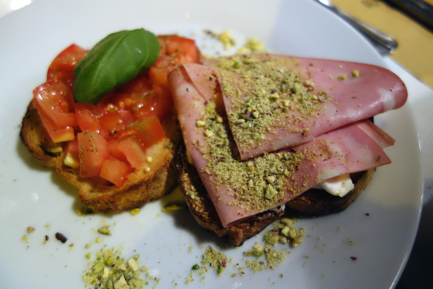 23 Published April 17, 2017 at 1500 × 1000 in The Big Last Meal at Elle Effe Next → Bruschetta with mortadella and pistachios, tomato and basil