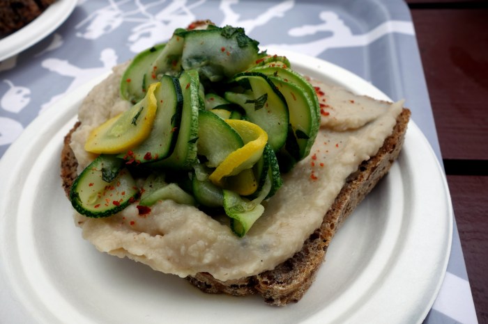 Another fika-hour open-sandwich was smeared with a thick and delicious chickpea puree and topped with a mound of thinly sliced ribbons of cooked green and yellow zucchini. I really enjoyed the mild nutty flavors of the chickpea puree which, with no sesame oil, was not really hummus but something lighter altogether. The zucchini was also cooked to a great texture, tender but with a bite, and the dusting of paprika over the top added a light heat to each bite.