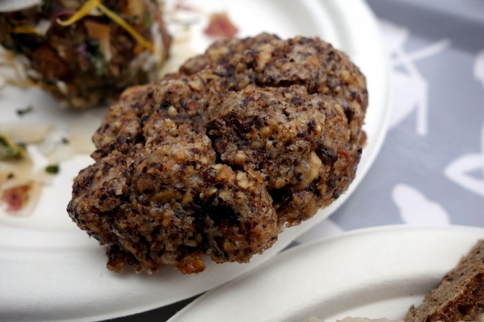 And for dessert, this dense vegan ball made with nut, coconut shavings and dried flowers. A gorgeous little mess of colors and flavors, only slightly sweet from the coconut and molasses or honey used to bind it. I really enjoyed the gooey and moist texture of this treat, with some added crunch from the pieces of nut.