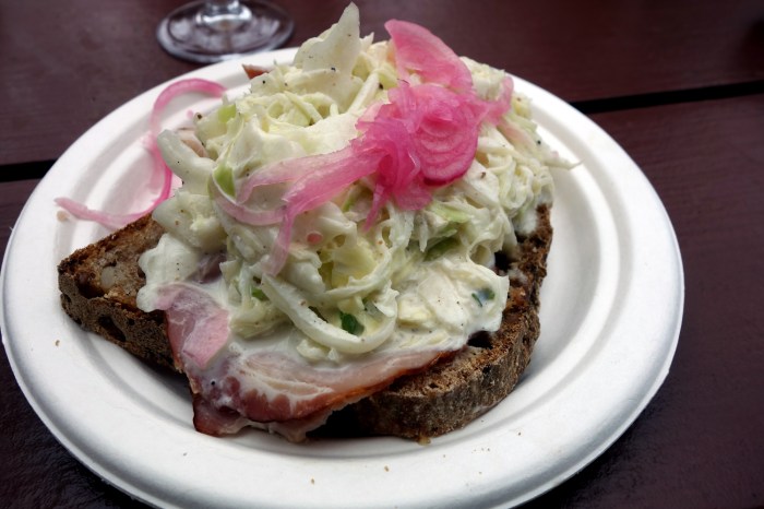 Next up, a heartier fika sandie, but still very light and wonderfully fresh in flavor. This one comes topped with a light smearing of butter (no doubt, homemade), along with two or three layers of smoked ham, a cabbage coleslaw salad and slices of pickled red onion. It’s a gorgeous dish of pink and white, loaded with flavor. The smoked ham is positively meaty and lean, with very little fat but tremendous wood-smoke flavor that goes perfectly with the crunchy, creamy and slightly sweet coleslaw. The latter is also hydrated by just the right amount of mayonnaise and seasoned with the perfect dose of mustard seed. The onions, finally, add a tart finish to the mix.