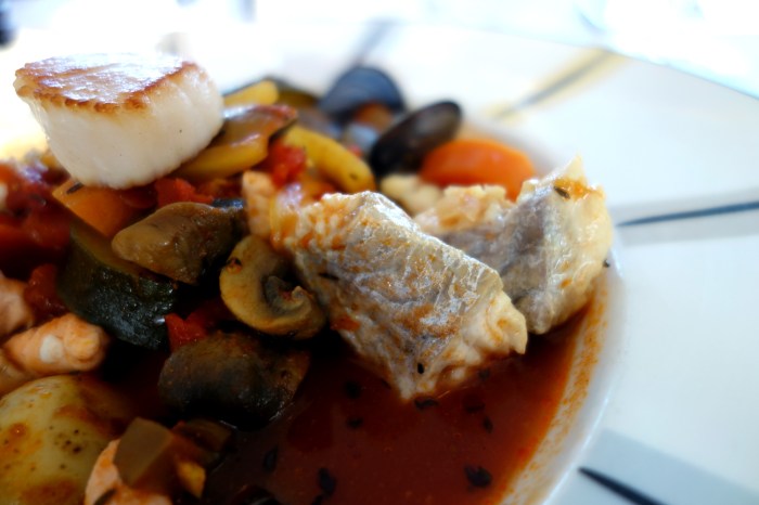And then there was my ballsier Gondolen Fish and Shellfish Casserole, similar to a San Franciscan cioppino. The collection of ingredients in this thing was quite amazing: white fish, mussels, scallops and shrimp with carrots, zucchini, potatoes and mushroom all swimming in a tomato-based sauce spiced up with chili. Served on the side were some crunchy croutons and creamy garlic aioli to munch along with the soup. I delicious dish and very generous with both ingredients and portion, though it lacked a tiny bit of salt, and the flavors of the broth seemed to overwhelm a bit the more delicate taste of the seafood inside. Very good, nevertheless; but on retrospect I regret not also ordering the hake.
