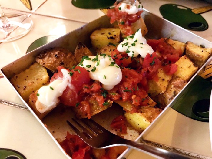 La Cava’s patatas bravas (hey, that rhymes!) are some of the best non-gourmet bravas in town, perhaps second only to Kasparo in El Raval. They come in a flat tin, a generous portion to share between two. The potatoes are perfectly cooked with the crunchy skins hit with coarse salt. Actual diced, stewed and spicy-seasoned tomatoes replace the spicy red sauce, which normally accompanies the “white sauce” (aioli) in this dish. The aioli is also quite good – creamy and smooth in texture and not as slimy as usual. The garlic flavor is there but not as aggressive as in versions of this dish I’ve had so many times before.