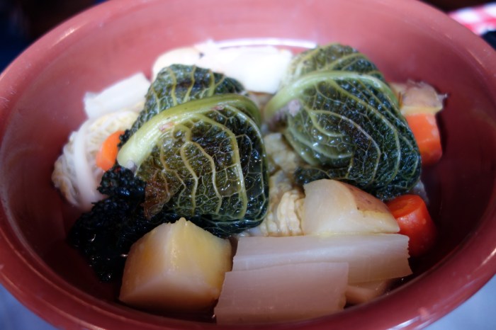 Ben got the choux farci auvergnat, curly cabbage stuffed with pulled pork shoulder and cooked in a pot-au-feu with cabbage, carrot, parsnip and potatoes. This was a very clean dish, the perfect steamy bowl of hearty vegetables and pork on a freezing cold February day. When slicing into the cabbage, the lumps of tender shredded pork spilled forth, very juicy and moist, delicately seasoned to allow the natural porcine sweetness and the subtle flavors of boiled veggies to dominate.