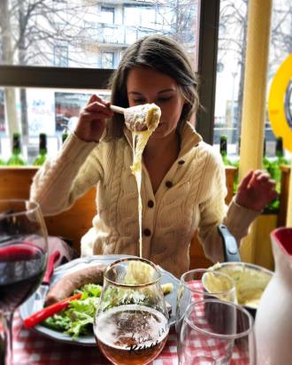 We rolled into Saint Nectaire at 2:00 a.m. at 40 km/h in a snow-white Fiat 500 with no chain on the tires, careful not to brake on the patchwork of slush and black ice that greeted us on the road. A surprise destination, I knew nothing about the Auvergne region (except that it was half-way between Burgundy and Bordeaux) or Saint Nectaire (except that there’s a famous cheese from there). The next day we would explore this region, also famous for the thermal baths of Mont Dore and the magnificent volcanoes of the Massif Central (one of which my fiance made me hike in Uggs…). I did remember that during a project at school a friend had mentioned aligot as a culinary specialty of that region. In fact, we ended up organizing an aligot party shortly after, where the same guy prepared the stuff for our closest group of friends. On that night I learned just how much effort goes into saturating a pot of mashed potatoes with so much Tomme… So when we rolled into Clermont Ferrand to find a bathing suit for me to wear in the sauna just after, we stopped by L’Oustagou, the first restaurant in the city recommended for this special dish.