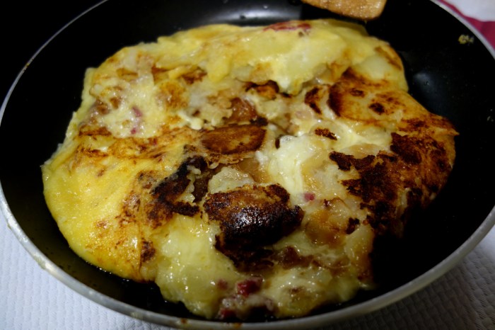 The truffade arrived to the table sizzling in the very same pan that cooked it, and a wooden spatula with which to divy it up and serve yourself. We each also got a bread basket and a plate of just-for-show lettuce with some slices of ham and salami lain over the top. I’m assuming these were meant to make little open-faced sandies with in the off chance that one’s still hungry after the main event. Truffade is made by sautéeing thinly sliced potatoes in duck fat until they are beautifully caramelized on the surface, seasoning with minced garlic and then gradually stirring shredded or finely chopped bits of soft local cheese until the latter melts around the potato, sticking the pieces together and forming a viscous, stretchy mass in the shape of the pan. Bits of ham or bacon are also often added for smoky, porcine zest to round out the cheese, which can be either Tomme or Cantal. In this case, it was made with Cantal jeune from the AOC Cantal, a cow’s-milk cheese with a fat content of 45%, aged for only 1-2 months. There were also some bits of bacon mixed in.