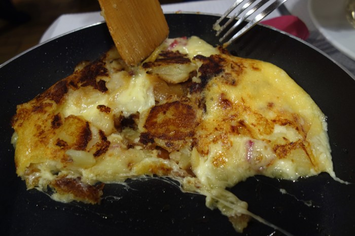 Just what does it feel like to swallow your first mouthful of truffade after a long weekend of cold, wet snow? Pretty epic. This is a dense, creamy and luscious blob with patches of beautifully crunchy, caramelized potato, revealing an almost sandy texture on the tongue, a reflection of the duck fat in which it was cooked. Here and there, pretty pink bits hint at smoky porcine zest. But the main star of the show is that cheese, that ooey-gooey mass of Cantal, which shows off a wide array of textures across this dish. The bits on the surface caramelize in contact with the pan, drying up into a crunchy brown crust. In other areas, the cheese melts together with the potatoes, interacting with the starchy surface to form a creamy, thick mash. Poke the blob in the center, and it will ooze out pure, melted Cantal, which tastes of slightly tangy, yet very clean, butter. Like it’s brother, the aligot, this dish showcases two very simple ingredients and makes for the perfect hearty wintertime mountain meal. Also like aligot, is has to be eaten rather quickly, before the cheese stiffens and loses its swagger. All in all, a wonderful culinary experience, with the pale red and very fruity house Gamay serving as the perfect complement to this simply and satisfying dish.