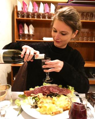 The auberge is a cozy place run by a chef named Martin and his wife who takes the orders. The menu is super simple, featuring very few ingredients, but those are sourced with care. Wines are Pinot Noir and Gamay from Côtes-d’Auvergne or Boudes, served in tiny glasses that need frequent refilling. The very limited list is supplemented by a quirky house cocktail made with blackcurrant syrup. We chose a Gamay from Caves Charmensat in Boudes and put in our order for the truffade.