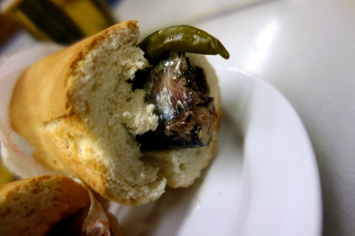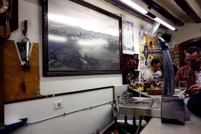 And then there’s Bar Soriano, which – I guess- makes only one tapa and has become rather famous for it: three cremini mushrooms dripping with garlic butter and a small shrimp in the center of each, mounted with a toothpick on a slice of baguette. A pain in the ass to eat, since it’s impossible to do so without removing each mushroom with your bare hands, there’s not much in terms of flavor to make it worth the challenge anyway. It’s just kind of rubbery, burning your mouth if you bite too soon and the limp shrimps have quite clearly been defrosted after a long time in the freezer. The mushrooms are too greasy to eat on their own but with the bread they form a bite too thick to fit your mouth. Pass on this one.