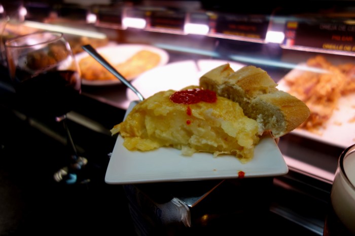 The first stop was Bar Sebas on the bustling Calle Laurel, which ended up being my favorite in terms of food quality. The thing to get here is the tortilla de patatas, served with a dollop of spicy chili sauce, similar to the red stuff paired with aioli on patatas bravas in Barcelona. As far as this very simple Spanish specialty goes, Sebas’s version was wonderful. The eggs were fluffy and smooth with a gorgeous bright yellow color, and the potatoes inside cooked to the perfect texture – tender but not too mushy, and offering a nice textural contrast with the egg. I honestly would not have minded staying here and eating just this one tapa all evening…