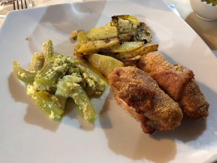 The main course centered around two pieces of chicken breast. These were rolled into logs, stuffed with a juicy and flavorful combination of garlic, sweet raisins and pine nuts. They were then covered with a layer of crispy bacon on the outside and speck on the interior for an extra hint of porcine flavor. They were probably shallow-fried with a hint of a breadcrumb crust whose crunch contrasted beautifully the smooth chicken inside. This was served with perfectly seasoned, thinly sliced wedges of roasted potato on one side and cucuzza longa, a thing that I had really been hoping to try. We first saw these at the Palermo market and took note. They’re a kind of very long green bean, which is actually “calabash gourd” in English, a type of squash. This was served chopped up and sauteed with some egg scrambled in. A very cozy and comforting plate of food.