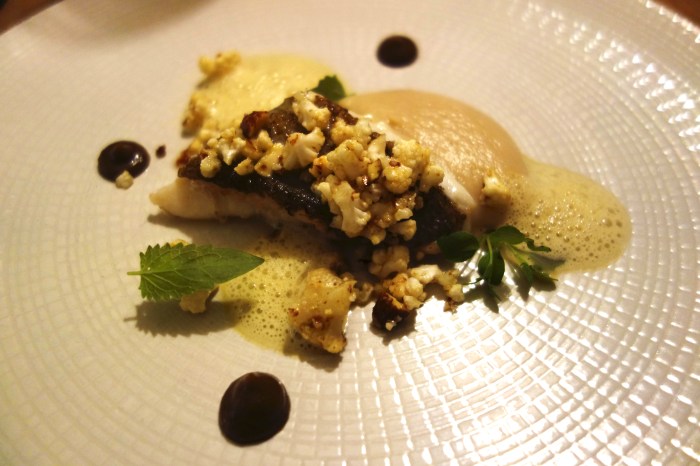 It started with a dish that perfectly captured my sentiments towards the changing of the season: ready for the comfort of fall, while reluctant to let go of the lightness of summer. In the center was a bright orange confit egg yolk, seemingly quite delicate but actually thick and unctuous, coating the fork in a gooey syrup of protein when broken into. Around it were a few thinly sliced rounds of piquant pickled butternut squash, pillow-soft butternut squash gnocchi and slices of fresh mushroom. Adding to the orchestra of flavors was a coffee foam, which kicked the pumpkin and yolk into an even cozier autumnal realm. If it weren’t for the granola of seeds (among them, of course, pumpkin) providing a necessary crunch, I would have probably drifted off, mid-chew, lulled into a kind of dreamy trance by the smooth, creamy textures of this dish. The crunch kept me engaged so that I could enjoy it even more. A flawless first course, paired with Les Greilles 2015 from Domaine Causse Marines, an extremely nuanced, biodynamic blend of Mauzac, Loin de L’œil, Ondenc and Muscadelle from the Gaillac region. The ripe yellow fruit and faded white flower petals in this wine matched beautifully with the vegetal sweetness of the pumpkin, while its acidity cut the creaminess of the yolk.