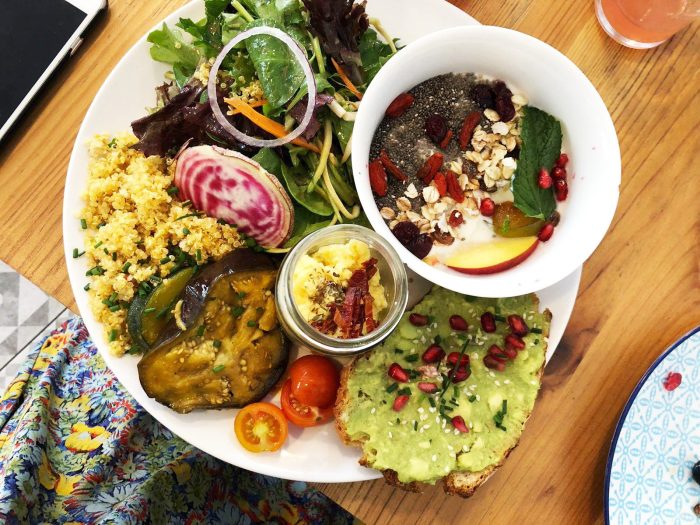 Some weeks ago she visited us in Bordeaux and we decided to go out for lunch. (She did, however, bring over a freshly made quiche, like 4 baguettes and several jars of jam, for good measure). After looking through a few brunch options, I chose Kitchen Garden, a restaurant specializing in vegetarian and vegan cuisine. The place itself is quite charming, with a small terrace outside and an eco-design interior, complete with white brick walls, gorgeous tiled floors, vintage botanical posters and refurbished wooden finishes. Fresh green potted plants all over… that kind of thing. On weekend mornings, they offer a set brunch menu, which consists of a fresh juice, a sweet dish and a rather large plate of treats that would work separately as tapas, but also go great together.