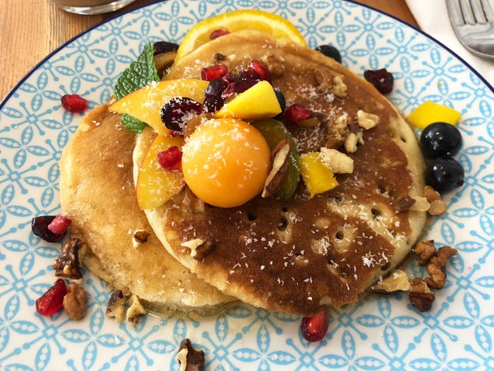 Next came pancakes with a choice of syrup of chocolate sauce (I chose syrup). These were fluffy and porous, allowing the syrup to soak in and sweeten them from the inside and out. Over the top were sprinkled some crunchy toasted walnuts, pieces of peach, a ball of melon, blueberries, dried cranberries, pomegranate seeds and coconut flakes. A delicious dish, busy with flavors and textures, but light enough to be the first course of a two-course brunch menu.