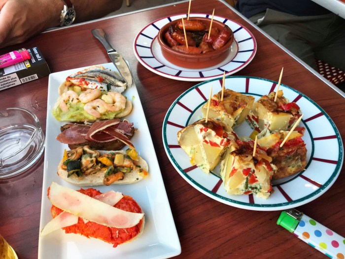I heard that in the morning they have viennoiseries (little pastries) with coffee and that they offer a great menu at lunch. They do oysters for Sunday lunch and have a more serious a la carte menu for dinner. They’re versatile like that. During “apero” hour, which is kind of like French happy hour and, needless to say, my favorite hour of the day, they offer a selection of tapas that go perfectly with your beer, wine or Ricard. They keep things pretty Spanish with this menu. The tortilla is divine. Thick, substantial, 2-bite chunks of potato tortilla, cooked to a perfectly tender texture and lit up by colorful veggies included in the mix. They also have these little spicy chorizo sausages, wrapped in a tight, perfectly blistered casing that snaps when bitten into. Not too greasy either. Sometimes they have padron peppers and white anchovies in vinegar. And sometimes they have this plate of montaditos, perfect to share. Little slices of baguette come with an array of colorful toppings: smoky roasted red pepper spread with cheese, mussels in vinegar, some Spanish ham, guacamole with baby shrimp, white anchovies sprinkled with piment d’Espelette.
