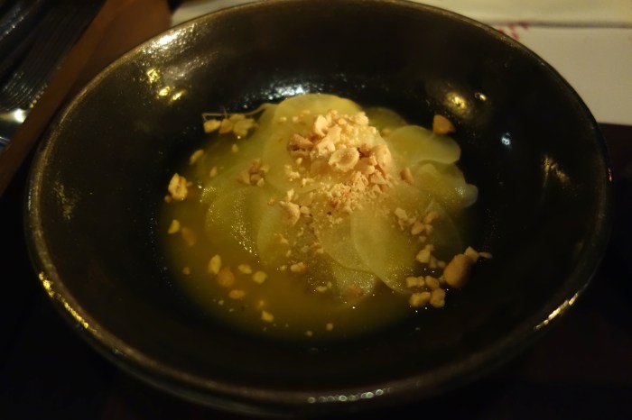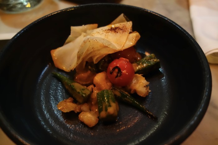 Next was something super special, the “Caribbean mojo.” Ruling over the dish in terms of flavor was a very serious Venezuelan sofrito, which seems kind of like the mirepoix of Latin American cuisines. Very deep and layered in flavor, this bright orange stew is made from a basis of patiently sautéed vegetables and maybe spiked with some kind of sweet pepper too. The sofrito was rubbed all over the tender, slimy chunks of okra and cherry tomatoes, as well as puffed up, crunchy hominy, “nixtamalization” not in ash, as was once traditional, but in some sort of calque mixture. Over the top were a few layers of crunchy, thinly sliced and marinated layers of celery root. A great combination of textures here with the sauce binding everything together.