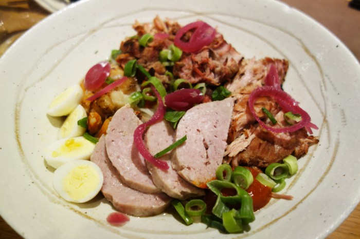 MENCHI KATSU KARE. Another fantastic Japanese dish was the Menchi Katsu Kare, whose focal point was the menchi-katsu, Panko-coated and deep-fried croquettes of minced beef, a type of yōshoku foods adopted from Western cuisine (menchi = minced, katsu = cutlet). This dish is traditionally served with chopped cabbage, which appeared in Mampuku’s version as well. The little balls of meat were divine, golden-brown and crunchy on the exterior, with a smooth, juicy, luscious pulled beef filling. They were served on a bed of rice with another preparation of what I think might have been the same cut of beef (shoulder? jowl?) Juicy fibers of pulled beef were served in a very mild Japanese curry sauce and paired with fukujinzuke, a kind of crunchy and tart pickled daikon, which perfectly complemented the flavors of the curry. I really enjoyed this dish, although I found two such complex preparations of beef to be a bit overwhelming when served on the same bed of rice. I would have maybe preferred the menchi-katsu on a separate dish, as an appetizer with a dipping sauce.