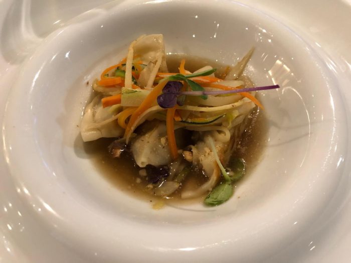For our first course, we chose a gyoza stuffed with chicken, served in an aromatic and clean broth with julienned carrots and cucumber, along with bits of peanut adding a crunch. The skin of the dumpling was slippery and sleek here, crunchy and caramelized there, and thin enough not to overpower the delicate filling side. The dish was light and delicate, but with plenty to offer in terms of flavor and texture. Perfect with a glass of white after an afternoon of pampering.