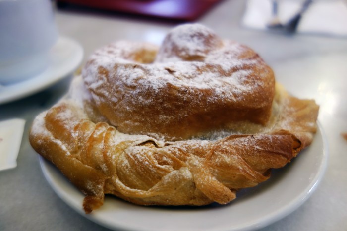 The ensaimada is a quintessentially Mallorcan delicacy, a must-try while staying on the island and a must-buy souvenir to bring back to friends. In fact, the (surprisingly gigantic) Palma airport has a “local specialties” shop almost exclusively dedicated to monstrously oversized versions of the thing, served in a kind of octagonal cardboard pizza box and priced at a slightly excessive 16 euros. (I bought 2.)