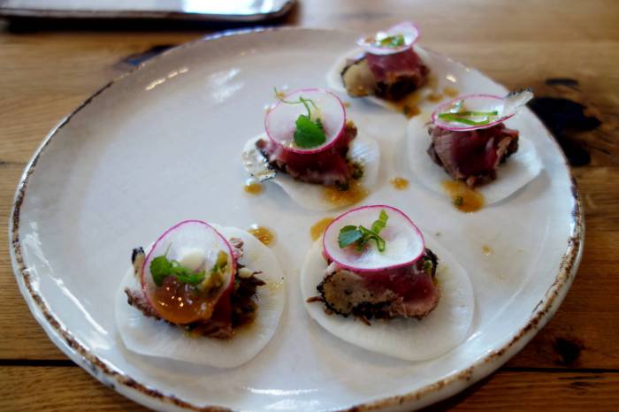 From the “garde-manger” section of the menu, we chose these bite-sized rounds of incredibly tender and velvet-smooth beef, marinated in a slightly piquant sauce and served with slices of fresh summer truffles on little plates of (what I believe was) black radish. A little cap of sliced red radish was laid over the top. Besides just being a very fun finger-food to share, these little radish tacos also offered an exciting combination of flavors and textures. The juicy, soft meat was complimented by the crisp snap of the radish on either side of it. A kind of earthy spice went beautifully with the minimally seasoned, clean beef, as well as with the fungal funk of the truffle and the touch of acid in the sauce.
