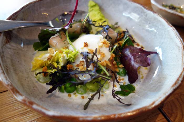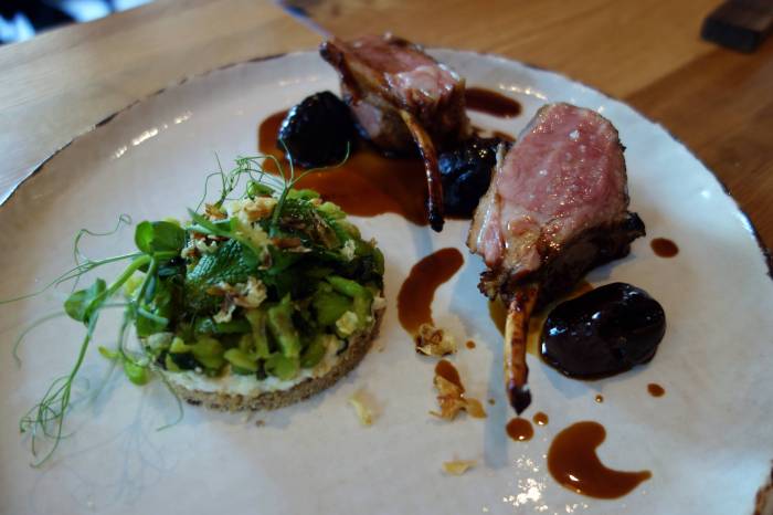 Our second dish from the “De la Robata” list were two heavenly chops of lamb from the Quercy appellation of the Lot region of France. Fun facts about these sustainably raised lamb: they have circular patches of black fur around their eyes and are fed their mother’s milk. This prized breed gives an incredibly succulent, beautifully marbled, pink meat with bright white fat and a heavenly, subtle flavor. These were cooked with a simple sear to make them tight and crispy on the exterior, and sprinkled with coarse salt to bring out the lovely natural flavors of the lamb. They were served with their cooking jus and a couple of plump, juicy prunes probably sautéed in the same. A great combo, with the prunes adding that ripe, jammy, almost umami flavor as well as a touch of sweetness. On the side was also a little tower that I didn’t end up paying too much attention to. It looked very pretty though – a kind of open-faced sandwich of microgreens, fresh mint and flash-cooked veg on a layer of creamy spread… But here it was all about the lamb.