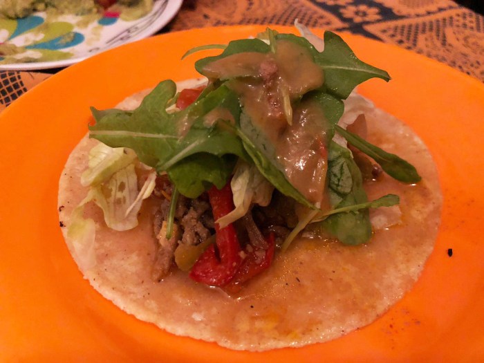 Next came two tacos. The Picadillo had beef with grilled red + green bell peppers and onions, topped with lettuce and a cream sauce. The Cochinita had juicy chunks of pork marinated until bright red with achiote grains, topped with onions and lettuce. Both were served on a homemade corn tortilla, but the ones we got were not warmed through all the way. The meats were nicely cooked, though lacked flavor (and, especially, spice), though for 3€ each perhaps they were worth it.