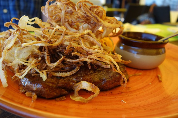 My brother got a classic hagymás rostélyos, which is a sirloin steak topped with a mound of crunchy fried onions. With it came the delicious reduced cooking jus of the steak. From the few bites I tried, it was tender and well cooked with the crunchy o’s adding an indulgent touch. Good stuff.