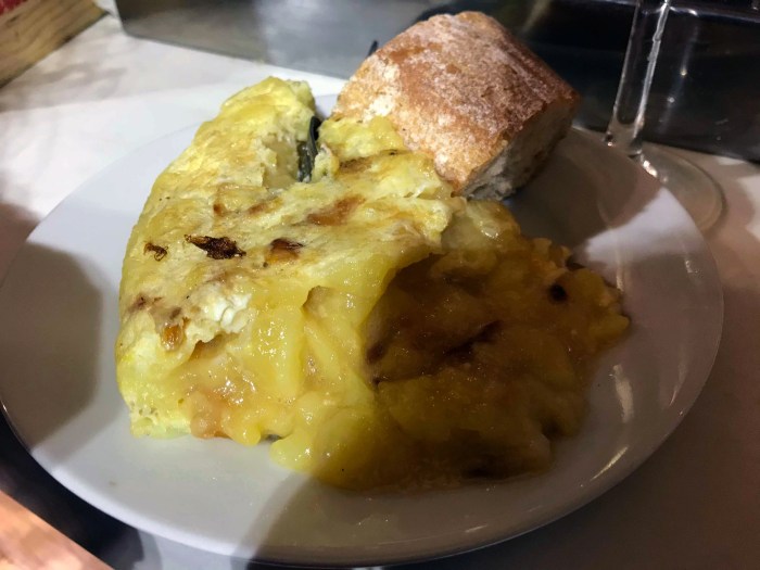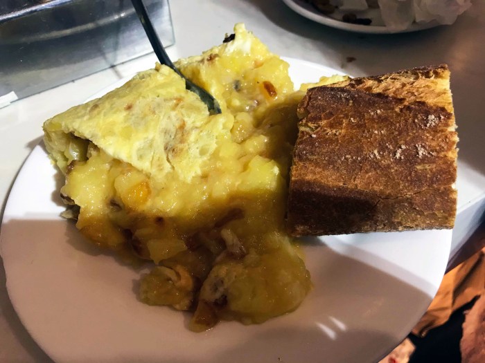 So we waited. My friend, patient. And I, apologetic. Finally, we got a space at the counter and hastily put in our order. Two tortillas, two cañas of Estrella Dam. The tortillas came relatively quickly and they were all I had hoped for and more. A triangular wedge, around an inch thick, served with a wedge of fresh bread. On the exterior, this tortilla is a fluffy, airy omelet, almost like a soufflé in texture, transitioning into glossy-wet, thick and warm egg in the center. A kind of creamy, molten, mashed interior. Running through the egg are bits of potato, poached in oil and perfectly tender. Textural contrast but just enough to keep the palate engaged. Caramelized onions are also in the house, adding their roasty-toasty natural sweetness to the mix. The thing is generously salted, as it should be. To be washed down with a cold beer.