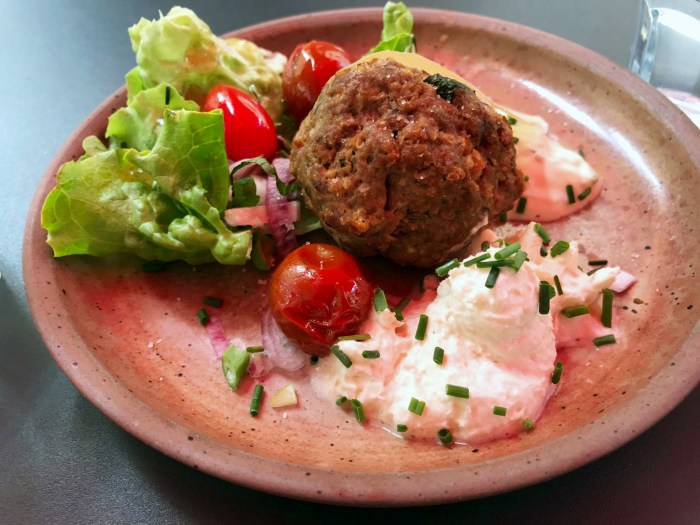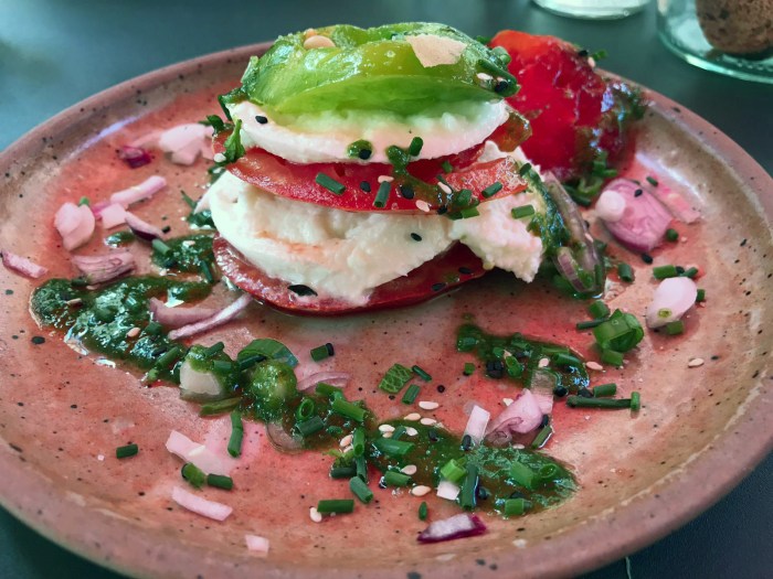 The kefta starter was delicious, made from beef from a nearby butcher, hand-pressed into a little ball and flavored with smoked paprika, cumin and mint. Perfectly cooked, yet not a touch of excess grease anywhere, so it was probably baked not fried. With it came a Stracciatella di Bufala type creamy, elastic cheese sprinkled with chives and a dollop of fresh yogurt to dip the meat into, a small side salad and cherry tomatoes that looked raw but were actually roasted and warm, a very pleasant surprise.