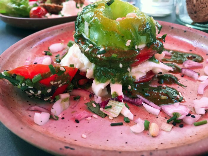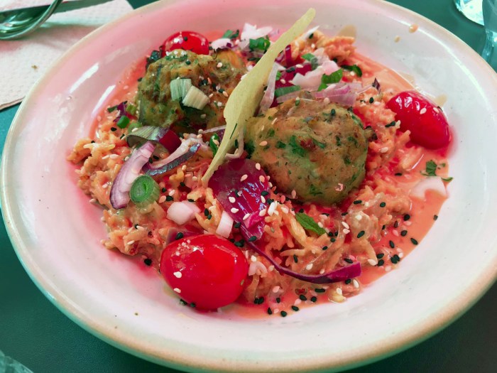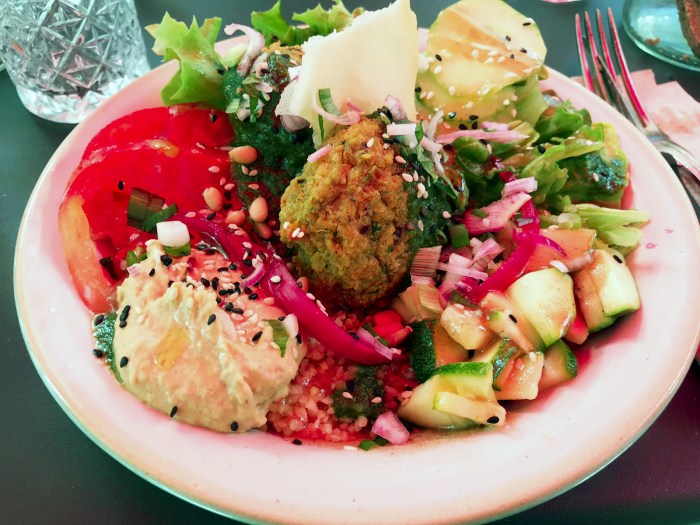 I got the “Salade Lichen,” a big beautiful plate of all their house hits with a single ball of falafel in the middle. The falafel itself was slightly too dense and dry for my liking, but nicely seasoned and served with a mouthwatering, house-made hummus, some bulgur, fresh tomatoes, cucumber and zucchini, raw and pickled red onions and lettuce, with the same white and black sesame seeds and toasted pine nuts sprinkled over the top. Some verdant basil pesto was squeezed over one part of the dish, some Asian sweet and sour suce over the rest. A single prawn chip added crunch.