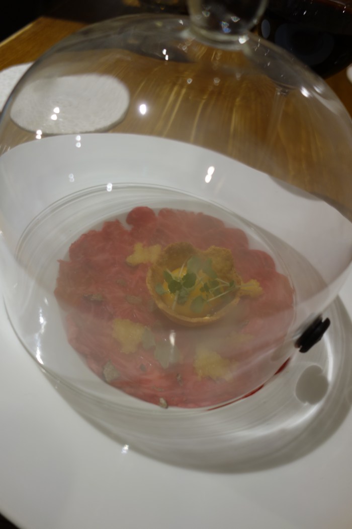 My entrée was a carpaccio of paper-thin Wagyu beef, the folding of which onto itself to form succulent little mouthfuls brought me great pleasure. The thing was presented under a glass cloche to keep in a kind of wood smoke to which it was exposed before serving. The smoke ended up licking the meat, leaving its gentle imprint but not overpowering the flavor of the beef. In the center of the carpaccio was a bright orange egg yolk inside a crispy, buttery, flaky basket of caramelized cornmeal crust which smashed into brittle little pieces under the touch of my fork. When the thick, dense yolk rolled over the thin, delicate slices of meat, it bound each bite together and hydrated it beautifully, adding a kind of silky-smooth, indulgent twist to the experience. Earthy bits of black truffle and some kind of smoky yellow caviar lent the dish umami and texture. Delicious.