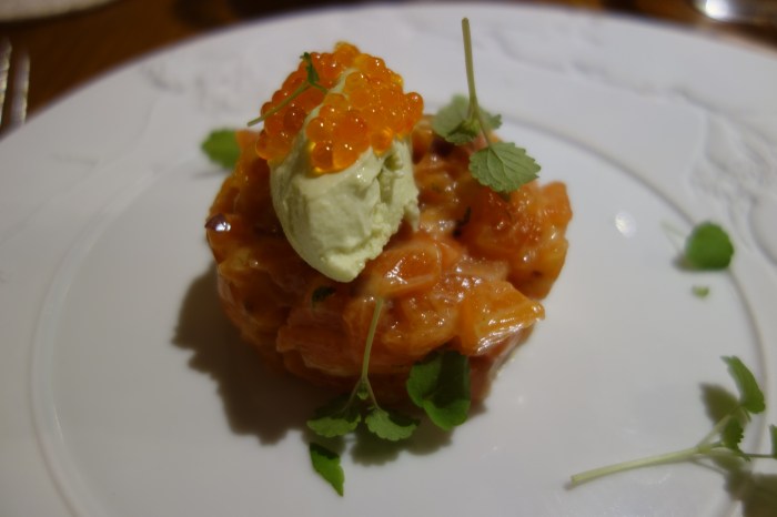 The first of our pre-entrée bouchées was a lovely little dish with slick lumps of cuttlefish and flying fish served in a slightly piquant cream of wasabi mayonnaise and tiny wasabi-flavored green beads. A pretty presentation on a kind of smooth black and white stone; a very light and fresh thing whose cool heat cleansed the palate and prepared it for the journey ahead.